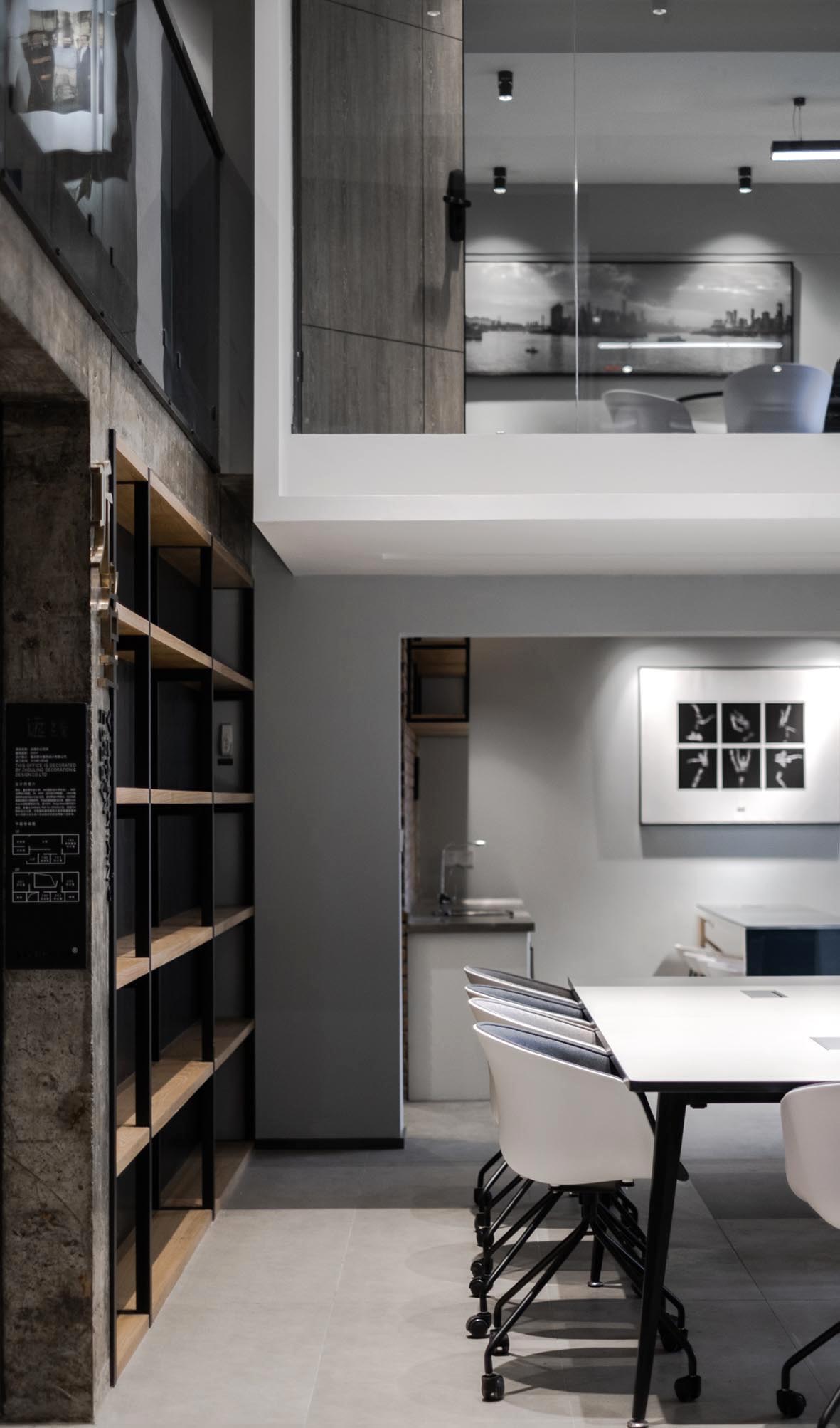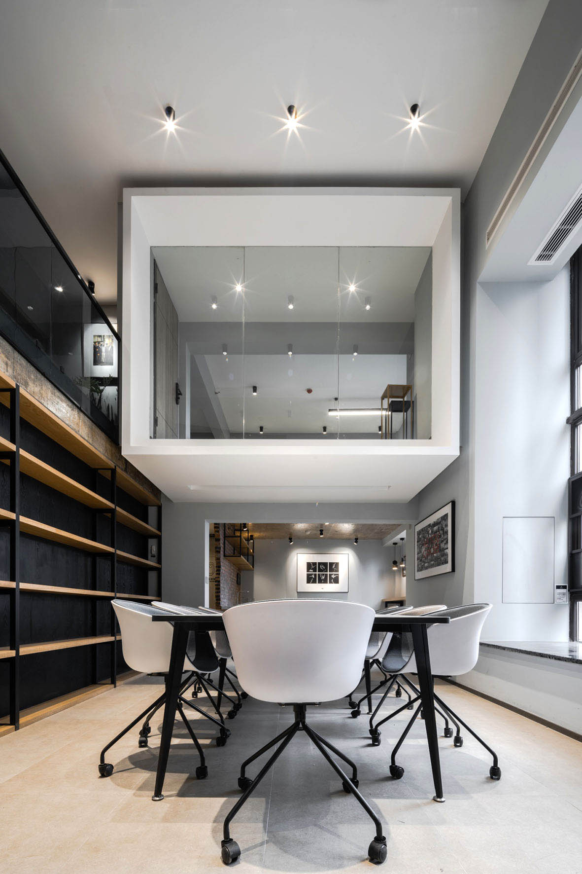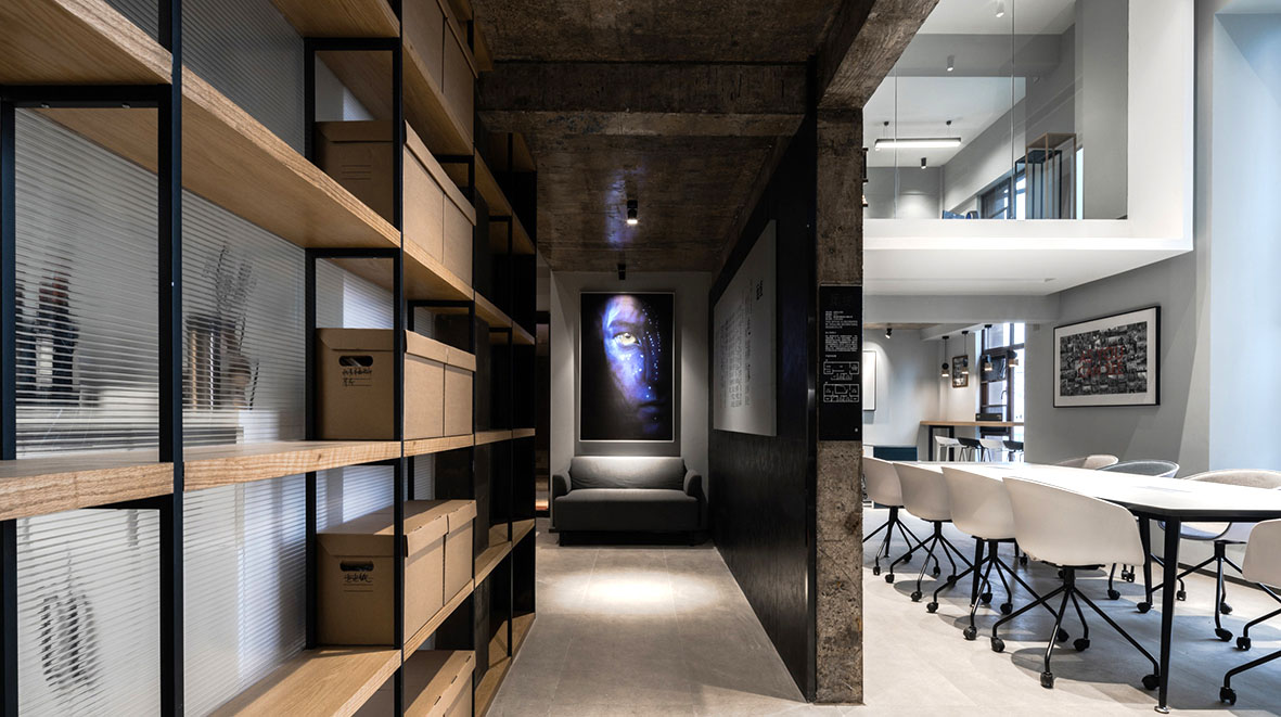 大廳,取名為“聽堂”。這里是日常開會(huì)議事的場所。二樓的框式造型,其設(shè)計(jì)靈感來源于畫幅、取景框等影視元素。穿過大廳,是咖啡吧和衛(wèi)浴空間。