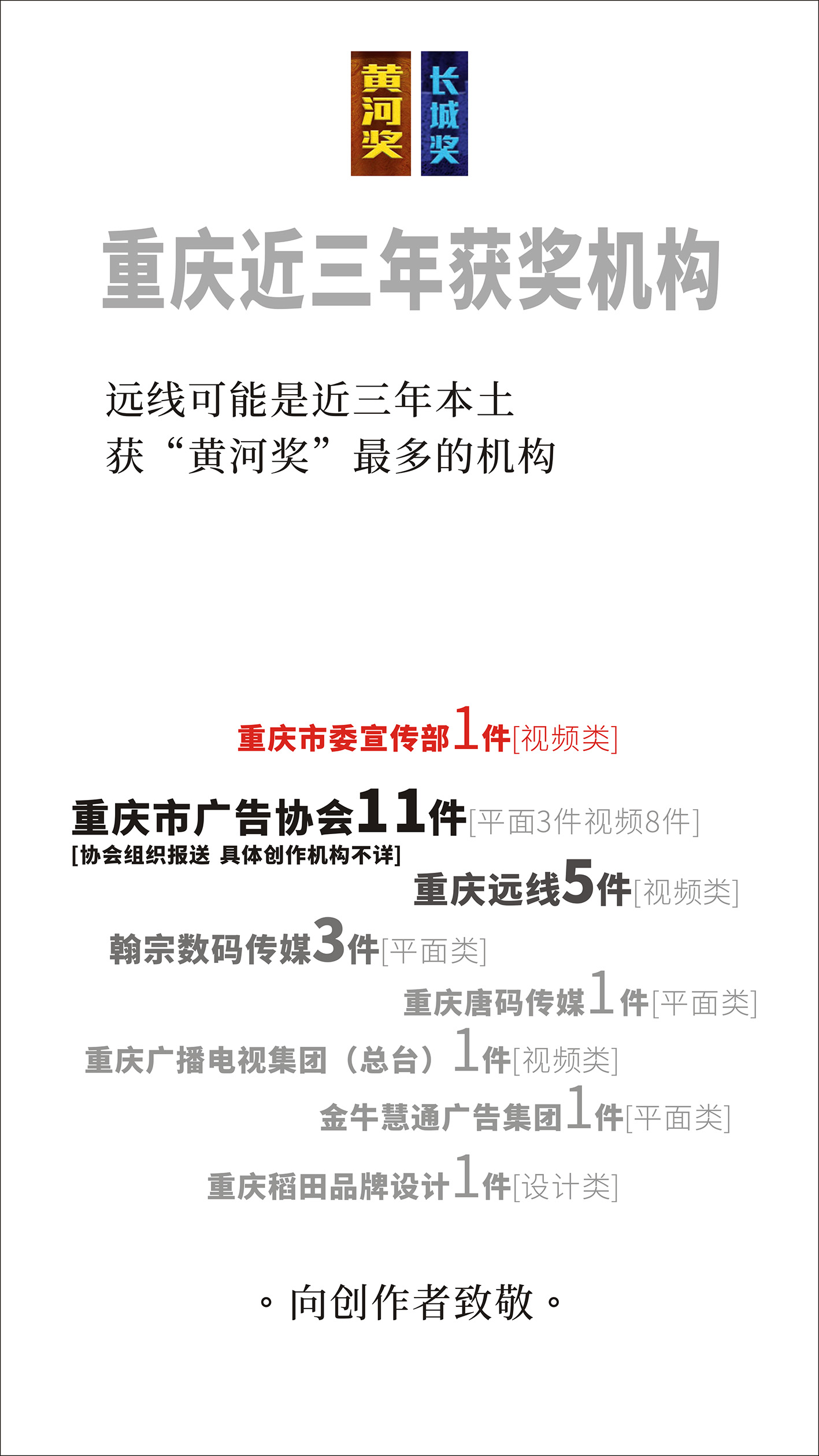 西部12省(直轄市及自治區(qū))共計(jì)17件作品獲獎(jiǎng),其中視頻類7件;成渝雙城經(jīng)濟(jì)圈共計(jì)11件作品獲獎(jiǎng),其中視頻類5件;重慶共計(jì)8件作品獲獎(jiǎng),其中視頻類5件。